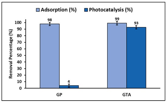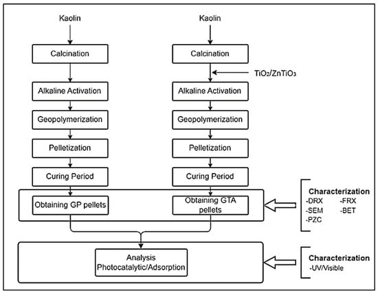 To obtain the geopolymeric compound called GTA (geopolymer/ZnTiO3/TiO2), the methodology explained above was used, but with a 3:7 ratio of ZnTiO3/TiO2:MK instead of the pristine metakaolin (MK). The combination of the ZnTiO3/TiO2 hybrid semiconductor with the metakaolin was carried out by mechanical mixing []. The synthesis of ZnTiO3/TiO2 nanoparticles was carried out following the sol-gel method described in previous investigations []. To obtain the ZnTiO3/TiO2 hybrid semiconductor, a solution of titanium (IV) isopropoxide (TIPP) and isopropyl alcohol (iPrOH) at a TIPP/iPrOH ratio of 70% v/v was prepared at room temperature. At the same time, a solution of zinc acetate dihydrate, isopropyl alcohol and water was prepared, to achieve a 3:1 TiO2/ZnO molar ratio. The iPrOH/water (50% v/v) ratio was established by stoichiometry, to allow hydrolysis of titanium isopropoxide. The titanium isopropoxide solution was slowly added to the zinc acetate solution while maintaining constant stirring at room temperature. As a result of this process, a white precipitate was obtained, which was dried at 60 °C for 24 h and then calcined at 500 °C for 4 h. After the curing process, the GP and GTA pellets were characterized and evaluated regarding their ability for adsorption and photodegradation of MB in aqueous solutions.