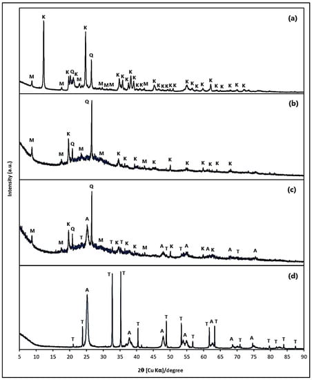 X-ray diffraction (XRD) pattern of (a) Kaolin, (b) Geopolymer, (c) Geopolymer/ZnTiO3/TiO2, and (d) ZnTiO3/TiO2. K: Kaolinite, M: Muscovite, Q: Quartz, A: TiO2, and T: ZnTiO3.