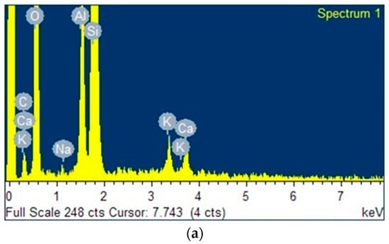 This investigation utilized various methods to analyze the samples. X-ray diffraction (XRD) measurements were performed by means of a Bruker-AXS D8-Discover diffractometer (Bruker AXS, Karlsruhe, Germany), which produced Cu Kα radiation with a wavelength of 1.5406 Å. Data acquisition took place in the angular range of 5 to 90° in terms of 2θ. The Crystallography Open Database (COD database, version 2021) was used to recognize the crystalline phases. X-Ray fluorescence (XRF) analysis was conducted by means of a Bruker S1 Turbo SDR portable spectrometer (Bruker Handheld LLC, Kennewick, WA, USA). This analysis utilized the Mining Light Elements measurement method. To measure the specific surface area (SSA) of the samples, nitrogen adsorption was at a temperature of −196 °C. The adsorption process was performed using a gas mixture consisting of 30% nitrogen (N2) diluted in helium (He) in the ChemiSorb 2720 equipment (Micromeritics, Norcross, GA, USA). The SSA was estimated applying the Brunauer-Emmet-Teller (BET) equation with the Chemisoft TPx system (version 1.03; data analysis software; Micromeritics, Norcross, GA, USA, 2011) by the single-point method. Micrographs and energy-dispersive X-ray (EDX) spectra were obtained employing a JEOL JSM 6400 scanning electron microscope (SEM-EDX) (JEOL, Peabody, MA, USA). The photoactivity of the samples was evaluated at λ = 310 nm using the IPW-UV-610 Stainless Steel Inner Sterilizer Light (IPW Industries Inc., Santa Ana, CA, USA), and the amount of MB residual in the solutions was quantified at λ = 490 nm using a Jenway 7350 spectrophotometer (Cole-Parmer, Staffordshire, UK). The study also involved determining the point of zero charge (PZC) for all the samples at room temperature (20 ± 2 °C) by applying the pH drift method, where ΔpH = pHf − pHi = 0. The experiment was carried out by adding 0.1 g of the solid sample to a 50 mL tube. In this tube, there was 25 mL of a 0.1 M NaCl solution. The pH of the solutions was adjusted to values ranging from 3 to 10 using 0.1 M HCl or NaOH solutions, and these values were noted as pHi. The tubes were then agitated for 24 h at 250 rpm, and the final pH of the supernatant liquid in each tube was measured and noted as pHf. By plotting ΔpH (ΔpH = pHf − pHi) vs. pHi, the PZC was determined. This process was repeated for both geopolymeric compounds using 0.01 and 0.05 M NaCl solutions. The tests were repeated three times, and the average value of the point of zero charge (pHPZC) was calculated and reported for each sample [].