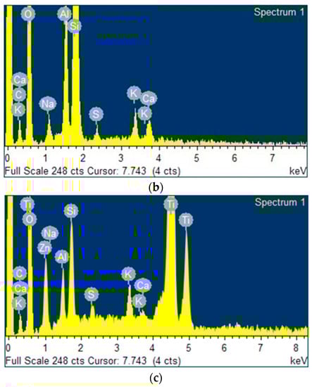 Figure 4a–c presents the spectra of kaolin, geopolymer (GP) and geopolymer/ZnTiO3/TiO2 (GTA), respectively. All samples have the exchange cations Ca and K. In addition, GP and GTA have the elements Na and S, which were incorporated as salts during the polymerization process. Finally, GTA has a high amount of Zn and Ti, due to the presence of the ZnTiO3/TiO2 semiconductor.