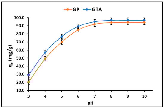 Effect of pH on the adsorption of dye on GP and GTA.