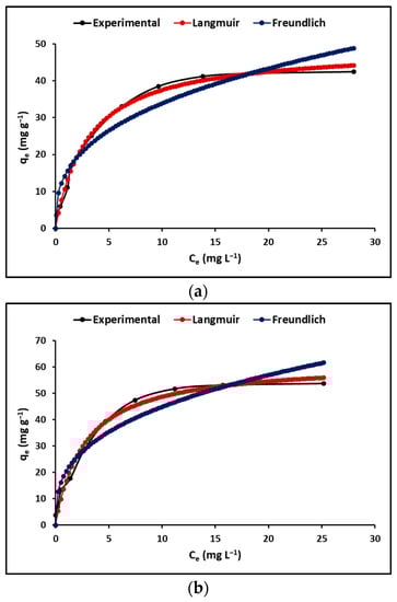 where the Freundlich constant (KF) expressed in L mg−1 represents the adsorption affinity of the adsorbents, while the constant 1/n specifies the adsorption intensity. For the adsorption to be favorable, the value of n must be between 1 and 10 [].