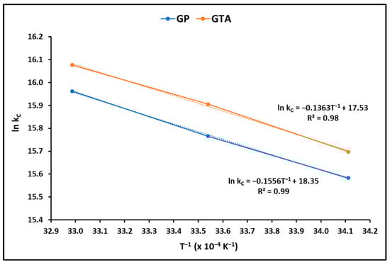 This study analyzed the Langmuir and Freundlich isotherms as equilibrium models that depend on the initial concentration of the adsorbate. The Langmuir isotherm assumes a uniform and homogeneous surface, where homogeneous and precise sites are accessible for adsorption, generating limited interaction between molecules. On the other hand, the Freundlich equation does not suppose uniformity in the energy of the surface sites, which reflects a heterogeneous surface with unlimited adsorption capacity. Figure 6 exhibits the adsorption isotherms of the MB molecule for the GP and GTA compounds. From this figure, it is clear that the Langmuir model is better than the Freundlich model in describing the behavior of both samples.