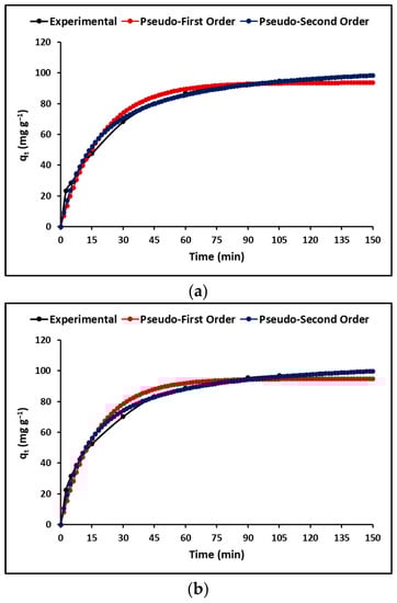 In this study the Lagergren (pseudo-first order) and Ho (pseudo-second order) models were applied to explain the effect of contact time or adsorption kinetics. As shown in Figure 8, both models reveal a fast initial adsorption phase followed by an equilibrium stage. As indicated in Table 6, the pseudo-second order model displays a higher correlation coefficient than the pseudo-first order model, indicating a chemisorption process [].