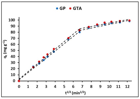 Intra-particle diffusion plots for MB adsorption by GP and GTA.