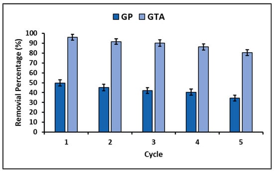 Finally, to confirm the reuse of the synthesized geopolymeric compounds for the photodegradation of MB, an experiment was carried out to evaluate their recycling potential. The reuse experiment comprised five successive treatment cycles, where at the end of each cycle, the suspensions were left to rest for at least one hour to then remove the supernatant liquid. The precipitated solids were washed with methanol containing 6% (v/v) acetic acid as eluent. After washing, the materials were dried and utilized in a new cycle. During each cycle, a fresh MB solution (20 mg L−1) was treated using 200 mg L−1 of geopolymeric compound. This experimental setup was based on previous research [].