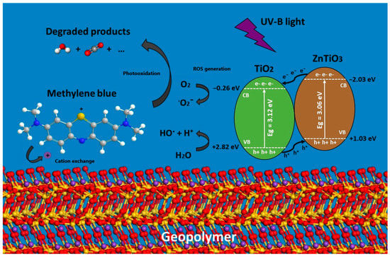 - Isabel Bravo, P.; Shimizu, E.; Alvin Malenab, R.; Anne Tigue, A.; Mae Dela Cerna, K.; Isagani Janairo, J.; Angelo Promentilla, M.; Ethelbhert Yu, D. Nanocrystalline Titania Coated Metakaolin and Rice Hull Ash Based Geopolymer Spheres for Photocatalytic Degradation of Dyes in Wastewater. Orient. J. Chem. 2019, 35, 167–172. [Google Scholar] [CrossRef]