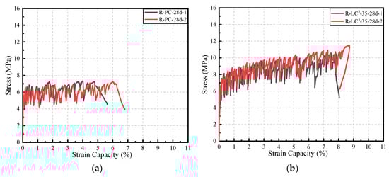 Tensile stress-strain curves: (a) R-PC-28d; (b) R-LC3-35-28d; (c) R-LC3-50-28d; (d) R-PC-150d; (e) R-LC3-35-150d; (f) R-LC3-50-150d.