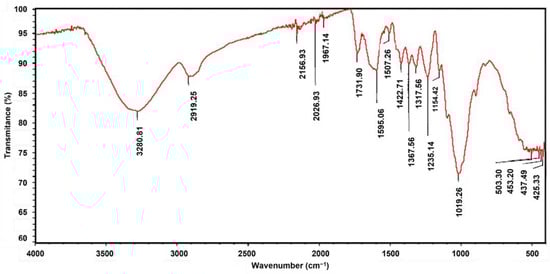 The peak at 1370 cm−1 was owed to the bending vibration of the C–H group of the aromatic ring in the polysaccharides [43,44]. The peak intensity observed at 1019 cm−1 corresponded to the vibration of the aromatic rings in lignin. Other authors reported that these band vibrations were attributable to aromatic ethers, the C-O stretching of cellulose and primary alcohols, and C-H in-plane deformation [43,44,45].