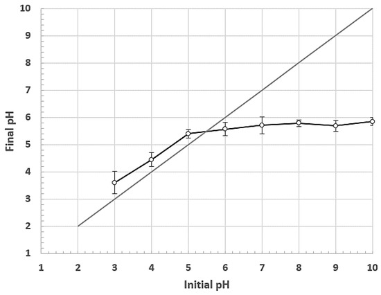 On the other hand, the point of zero charge (PZC) was measured by the method reported by Jiao et al. (2017) in a pH range between 2 and 10. PZC is an essential factor that describes the effect of pH variation on the fiber surface, indicating the active sites of the adsorbent and, consequently, its adsorption capacity [68]. The PZC indicates the most suitable pH range to efficiently remove the targeted pollutants according to their charge between anionic or cationic [69]. Figure 3 shows the relationship between the initial and final pH of the solutions with fique fiber. The final pH values ranged between two and six.