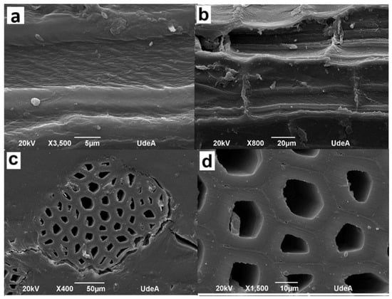 Figure 5 presents the longitudinal (a,b) and transversal (c,d) images of the fique fiber by scanning electron microscopy (SEM).