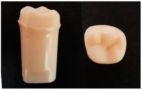 The artificial abutment (LR 62, Nissin Dental Product Inc., Kyoto, Japan) (Figure 1) was selected from the first molar of the lower-right mandible (#46), which has an elastic modulus similar to that of a natural tooth [], and was therefore chosen to simulate a natural tooth abutment. The artificial tooth abutment used for the PEEK crown was prepared according to the clinically recommended finishing line (margin) of the tooth preparation thickness of 0.50 mm and occlusal surface thickness of 1.0 mm. Each artificial tooth abutment was scanned directly with a scanner (inEos X5, Dentsply Sirona, Charlotte, NC, USA), and a CAD system (built-in software, 3Shape, Copenhagen, Denmark) was used to create a consistent crown shape. The PEEK crowns of the first molar of the lower-right mandible were then fabricated by a CAM system (MC X5, Dentsply Sirona, Charlotte, NC, USA).