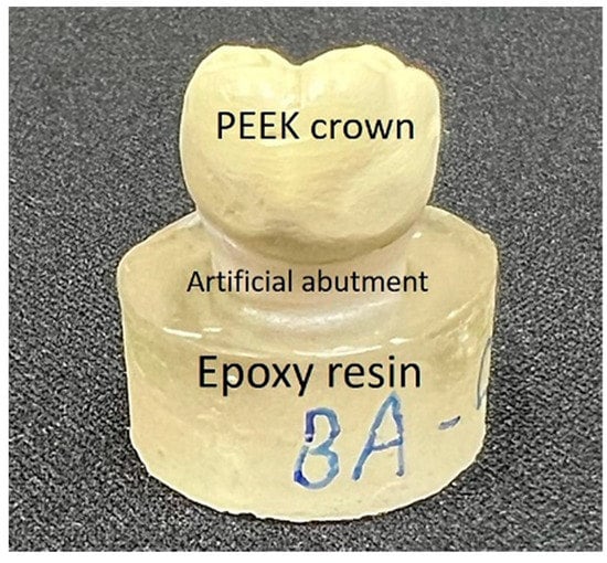 The crown samples were cleaned by shaking them in 95% alcohol and then dried with air. A dental blasting machine was used to blast the inside of the crown with 120 µm aluminum oxide particles at 2 bar pressure for 10 s, with a distance of 10 cm between the nozzle and the sample. The sample was then cleaned with distilled water and blown dry with pressurized and filtered gas from a dental air gun. Finally, a medical-grade adhesive (EA M-31 CL, Loctite, Rocky Hill, CT, USA) was applied to the interior of the crowns and the surfaces of the artificial abutments, and the crowns were placed on the artificial abutments and pressed for 1 min to remove the excess adhesive from the edges of the crowns. The abutments cemented with PEEK crowns were embedded in the epoxy resin (EpoFix Kit, Struers, Rødovre, Denmark) (Figure 2) before performing the subsequent compressive tests, as described below.
