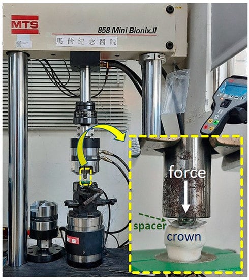 All crown samples adhered to the artificial abutments were subjected to compressive tests, performed using a universal test machine (Bionix®-858, MTS, Eden Prairie, MN, USA) with a loading rate of 1 mm/min (Figure 3). The loading head was made of 430 stainless steel with a half-round diameter of 3 mm, and a 0.5 mm thick co-polyester spacer (Imprelon® Spd, Scheu-Dental GmbH, Iserlohn, Germany) was placed between the loading head and the PEEK crown in order to apply a uniform force to the surface of the PEEK crown. The moment of fracture of the PEEK crown was recorded as the fracture load (N), and all fractured PEEK fragments were collected and analyzed as mentioned in the following.