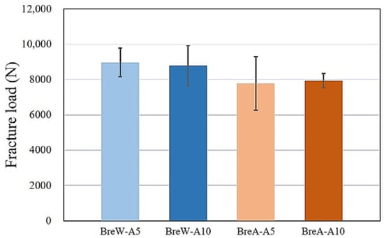 Fracture load (N) vs. test PEEK crowns (BreW and BreA) after 5 and 10 h of aging treatments: BreW-A5, BreW-A10, BreA-A5, and BreA-A10. No significant difference in fracture load was observed among the test groups after the paired t-test analysis (p > 0.05).