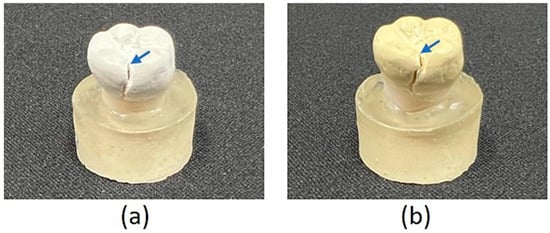 Visual observation of fracture surface morphology of test PEEK crowns: (a) BreW-A5; (b) BreA-A5 (arrows representing the cracking initiation), showing the fracture extended from the occlusal surface of the crown (as indicated by the arrow) along the lingual sulcus to the edge of the crown and finally ruptured.