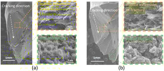 SEM observation of fracture surface morphology of test PEEK crowns: (a) BreW-A5; (b) BreA-A5, showing the beginning of the fracture, the middle extension of the fracture, and the end of the fracture.