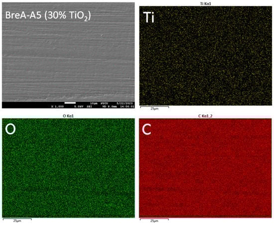 Figure 7 shows a SEM micrograph of the fractured surface of BreA-A5 after grinding and its corresponding EDS mapping analysis of Ti, O, and C elements. The brightly colored spots indicated relatively high elemental content. The results of the EDS analysis showed that the Ti and O elements were uniformly dispersed in the 30% TiO2-containing PEEK matrix.