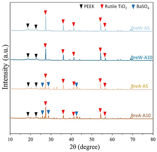 In addition, the crystallographic analysis of the BreA group revealed sharp peaks between 25° and 45° (blue inverted triangles for BreA-A5 and BreA-A10 in Figure 8), which, in comparison with the previous studies [,], are presumed to be the crystalline structure of BaSO4. Therefore, in addition to the PEEK matrix and rutile phase TiO2, the BreA groups were confirmed to contain small amounts of BaSO4. It is known that BaSO4 has been used as an additive to enhance the mechanical strength of PEEK, but it is not as effective as TiO2. Therefore, most PEEK on the market still uses TiO2 as the main additive []. One possible purpose of adding BaSO4 to commercial PEEK is to enhance the visibility of the polymer in medical X-ray and magnetic resonance imaging (MRI) tests [].