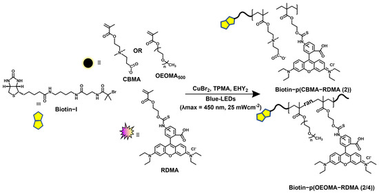 The synthesis of biotinylated multifunctional dye copolymers was performed using a recently developed fully oxygen-tolerant, photoinduced atom transfer radical polymerization (ATRP) [108]. The copolymerization of zwitterionic and hydrophilic CBMA monomer and dye-labeled rhodamine-B-methacrylate (RDMA) monomer was performed in an aqueous medium under blue-light irradiation (λmax = 450 nm, 25.0 mW/cm2), using biotin-I as the initiator, Eosin Y (EYH2) as the organic photoredox catalyst, and CuBr2/TPMA as the deactivator (Figure 1).