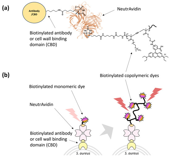 Herein, we report the synthesis and characterization of a polymeric dye complex containing a binder such as an antibody or the cell-wall binding domain (CBD) from a lytic enzyme for a highly sensitive bioimaging technique for pathogen identification. Putative autolysin from Staphylococcus aureus (SA1) contains a cysteine, histidine-dependent amidohydrolases/peptidases (CHAP) domain and a putative CBD [118]. The CBD from SA1 was successfully expressed and exhibited high selectivity to Staphylococcus aureus, similar to the CBD of lysostaphin, a lytic enzyme known for its specific targeting of Staphylococcus aureus [119]. The approach involves the coupling of Staphylococcus aureus targeting polyclonal antibody or CBD of SA1 to rhodamine dye-labeled copolymers comprised of oligo (ethylene oxide) methyl ether methacrylate or carboxy betaine methacrylate (CBMA). The polymers were grafted from a biotin-functionalized ATRP initiator under blue-light irradiation using Eosin-Y/Cu-mediated fully oxygen-tolerant ATRP technique. The nondestructive binding properties of the copolymeric dye complex were tested on the target bacterial cells and were applied to the bioimaging of target bacteria using fluorescence detection and confocal microscopy analysis.