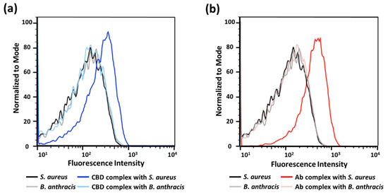 We then assessed binding onto single bacterial cells using flow cytometry. The addition of each binder-p(OEOMA500-RDMA (4)) complex generated a clear change in the fluorescence intensity compared with the target S. aureus cells alone (Figure 5), suggesting that the fluorescence of each binder-p(OEOMA500-RDMA (4)) complex comes from binding to the surface of S. aureus cells. Furthermore, we confirmed the specificity of these complexes using flow cytometry. In both binder cases, the complex did not bind to B. anthracis Sterne cells, as no fluorescence was detected. These results suggest that we have generated complexes that are target-specific and can bind to the target bacterium, induced by antibody or CBD.