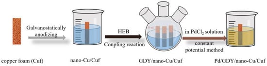 Pd nanoparticle film was obtained via a constant potential method on the surface of GDY/nano−Cu/Cuf. The GDY/nano−Cu/Cuf electrode was dipped in PdCl2 (20 mM) solution at a voltage of −0.2 V with Ag/AgCl wire and Pt wire as the reference electrode and counter electrode. After lasting for 60 s, the Pd/GDY/nano−Cu/Cuf electrode was obtained. The diagrammatic flow chart of the whole synthesis procedure is shown in Figure 1.