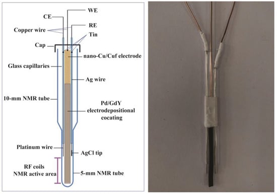The NMR−electrochemical cell is schematically shown in Figure 2. It consists of a Pd/GDY/nano−Cu/Cuf electrode as WE, a platinum wire as CE, and an Ag/AgCl wire as RE. To reduce the mutual interference of EC and NMR, only the part of WE located in the range of RF coils in the NMR probe. For fabrication of the CE, a copper wire and a platinum wire (0.5 mm diameter) were introduced from each side of the glass capillary. The contact between the copper wire and the platinum wire was made by a tin weld. RE was fabricated using the same method. RE and CE arranged together with the WE to avoid short circuit. The three electrodes were connected to the electrochemical workstation by copper wires and a 2 m long cable. The electrode system of all three electrodes was inserted in the NMR tube. When the in situ experiment were performed, a voltage was applied to the electrode system, and NMR monitoring was performed while the electrochemical reaction was taking place.