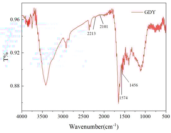 The morphologies of the Cuf, nano−Cu/Cuf, GDY/ nano−Cu/Cuf, and Pd/GDY/ nano−Cu/Cuf electrodes are shown in Figure 3. As can be seen in Figure 3a, b, the morphology of Cuf changes from smooth and flat to a homogeneous nanoflower shape after electrochemical treatment. Cuf nanoflower petals appeared with width ranging from 200 nm to 300 nm and lengths of about 700 nm. Moreover, as a base material, Cuf possesses high conductivity and a unique three-dimensional porous structure. The morphology of nano−Cu/Cuf would be helpful to the flow of electrolytes and give a larger surface area. The SEM image of Figure 3c shows that the surface of nano−Cu/Cuf is covered by layers of GDY. The morphology of Pd/GDY/nano−Cu/Cuf is shown in Figure 3d. It is seen that the nanogranular of Pd tightly encapsulates the surface of GDY/nano−Cu/Cu. Due to the Pd film’s small particle size and large specific surface areas, the modified electrodes would have a high catalytic activity for QH2 oxidation. Figure 4 shows the Fourier transform infrared spectroscopy (FT−IR) spectrum of as-grown GDY film on Cuf. The bands located at 1456 cm−1 and 1574 cm−1 are assigned to the skeletal vibrations of aromatic ring, and the wide band of 2101 to 2213 cm−1 is the typical C≡C stretching vibration. The results of FT−IR spectrum are in good agreement with the reported results of GDY [33].