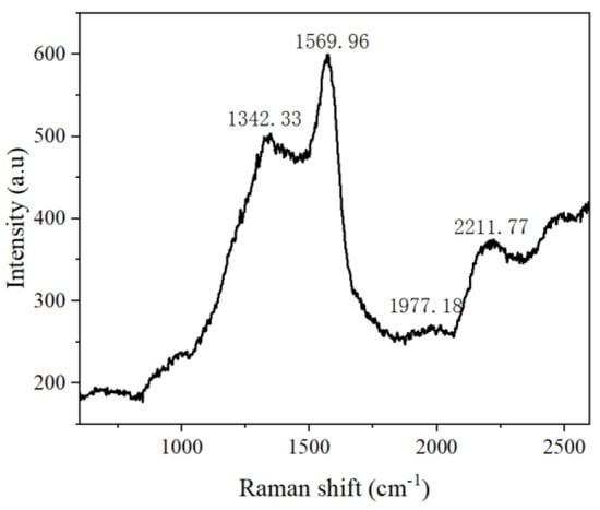 Figure 5 shows identical binding energies for the C 1 s orbital. The presence of an O 1 s peak at 5 shows the XPS spectrum of C 1 s. The C 1 s peak at 284.8 eV in Figure 5a shows that 31.7 eV is due to the absorption of air in graphdiyne. As shown in Figure 5b, four fitting peaks of 284.3, 285.0, 286.9, and 288.3 eV can be assigned to C−C (sp2), C−C (sp), C−O, and C=O, respectively. C−O and C=O occurs because GDY absorbs oxygen when the sample is exposed to air. The area ratio of C−C (sp)/ C−C (sp2) is 2, which confirms that the benzene rings link with others by diine in as-prepared GDY. GDY can be qualitatively determined according to the ratio of C−C (sp) and C−C (sp2), and oxygen content in XPS spectra. The result of the XPS spectrum is in good agreement with the reported results of GDY [15]. Moreover, Raman spectroscopy was used to evaluate the quality and uniformity of GDY on the surface of copper nanoflower. As shown in Figure 6, the Raman spectrum of GDY has four typical peaks, among which the peak at 1350.2 cm−1 corresponds to the respiratory vibration of the benzene ring, which can also be called the D band of GDY. The pronounced D band is a disordered band associated with structural defects, amorphous carbon, or edges that can break the symmetry and selection rule [33]. The peak at 1569.9 cm−1 corresponds to the first−order stretching vibration sp2 carbon domains in aromatic rings, which is the G band of GDY, and the peak at 2211.7 cm−1 belongs to the stretching vibration of the conjugated diyne bond [34]. The results of the SEM, FT−IR, XPS, and Raman spectrum analysis indicate that the GDY nanosheets were successfully realized on the surface of the nano−Cu/Cuf−based electrode with HEB monomers and pyridine.