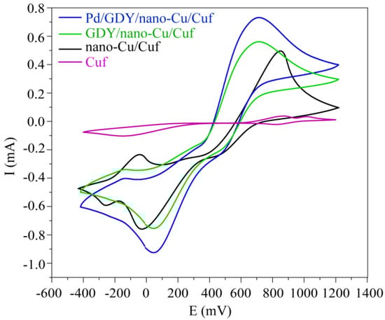 To investigate the electrocatalytic behavior of QH2 at various electrodes, cyclic voltammograms were obtained in aqueous solution as shown in Figure 7. The oxidation of QH2 is a two−electron transfer process; the oxidation peaks arises at about 650 mV at Pd/GDY/nano−Cu/Cuf electrode. Compared to the results for the Cuf electrode, the redox peak currents at nano−Cu/Cuf electrode and GDY/nano−Cu/Cuf electrode were increased in sequence with the peak−to−peak separation value decreasing. The trend signifies that the reversibility of the electrode reaction improved. It is noteworthy that the redox peak currents at Pd/GDY/nano−Cu/Cuf electrode were further increased. In addition, compared to the situation for the Cuf electrodes, the redox peak current at the Pd/GDY/nano−Cu/Cuf electrode was much higher. The result indicates that the Pd/GDY/nano−Cu/Cuf electrode would present the highest catalytic performance toward QH2 electrochemical oxidation.