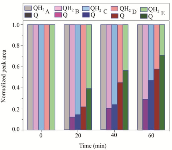 Normalized peak areas of the 1H NMR spectra for the hydroquinone oxidation during electrolysis process in aqueous solution at 650 mV with different electrodes (A, B, C, D, and E). These electrodes include electrodeless, Cuf, nano−Cu/Cuf, GDY/nano−Cu/Cuf, and Pd/GDY/nano−Cu/Cuf electrodes, which are labeled as A, B, C, D, and E, respectively.