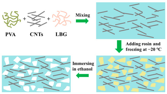 Porous LBG-based hydrogels were prepared by mixing 4 g PVA (1750 ± 50, Shanghai Yuanye Bio-Technology Co., Ltd., Shanghai, China), 300 mg CNTs (XFNANO Materials Tech Co., Ltd., Nanjing, China), and 40 mL deionized water. The mixture was heated to 100 °C under vigorous stirring until fully dissolved PVA. Then 1 g LBG (Aladdin, Shanghai, China) was added to the mixture. The rosin particles and the mixture solution were stirred at specific ratios until reaching homogeneous dissolution. The mixture was transferred to an environmental cabinet at −20 °C for 12 h to form LBG/PVA/CNTs/rosin hydrogels. The hydrogels were immersed in ethanol for 24 h to dissolve rosin particles.
