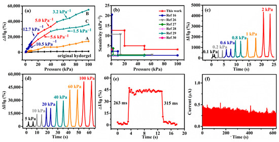 (a) The relative current changes for the sensors with original hydrogels and hydrogels A, B, and C; the slope of the curve indicates sensitivity. (b) Detection range and sensitivity of our sensor with hydrogel B in comparison with other piezoresistive sensors based on hydrogels as reported in references [16,26,27,28,29,30]. (c) The relative current changes for the sensor with hydrogel B under low serial pressures (0.1–2 kPa). (d) The relative current changes for the sensor with hydrogel B under high serial pressures (5–100 kPa). (e) The sensor’s response time and recovery time with hydrogel B. (f) Stability of the sensor with hydrogel B at 3 kPa for 500 cycles.