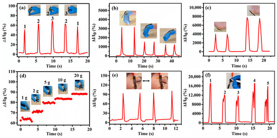 The signal responses arise from (a) finger bending, (b) wrist bending, and (c) elbow bending. (d) The signal responses of the sensors attached to the finger-holding standard weights of 1, 2, 5, 10, and 20 g. The signal responses from (e) eye blinking and (f) different handwriting.