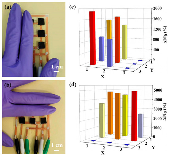 (a,b) Photograph of a sensor array (3 × 3 pixel) with different devices pressed by two fingers, and (c,d) and their corresponding signals.