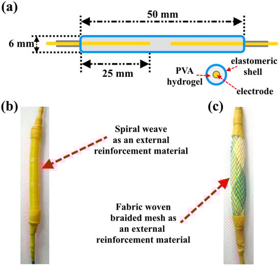 A stretchable elastomeric shell with a length of 50 ± 5 mm and an inner diameter of 6 ± 0.5 mm was filled with 2 mL of PVA hydrogel. Two copper wires were used as electrodes. The length of each electrode inside the shell was 25 ± 1 mm. Figure 2a shows a schematic design of the PVA hydrogel-based actuators. The stretchable elastomeric shell was reinforced by two types of external reinforcement, as shown in Figure 2b,c. The internal diameter of both external reinforcements was 6 ± 0.5 mm.