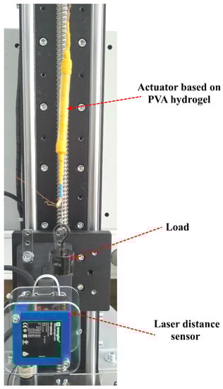 To investigate the contraction/extension values of the prepared actuators, the high-performance laser distance sensor Wenglor YP11MGVL80 (Wenglor sensoric GmbH, Tettnang, Germany) was used. This sensor has the following characteristics: linearity—0.5%, measuring range—50 mm, resolution—20 um, shown in Figure 3.