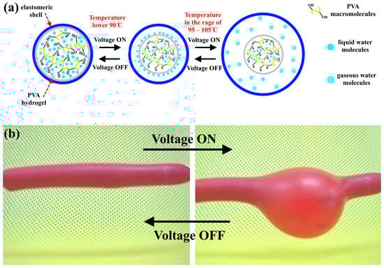 When an AC voltage is applied, the hydrogel undergoes heating, leading to the swelling of the samples. This phenomenon can be explained by the interaction of molecular bonds with the network structure, as depicted in Figure 5 (see Video S5). Under normal room conditions (AC voltage is off and temperature is 25 °C), the hydrogel has a minor swelling ratio, which is related to the compressed network structure formed by hydrogen bonds. This is referred to as the “shrinking and bonding status”. By applying the AC voltage, the hydrogel heats up, leading to a weakness in the hydrogen bonds, which in turn leads to a stretching in the twisted polymer molecular chain. This will lead to a volumetric contraction of the PVA hydrogel with a decrease in its viscosity. When the temperature is higher than 95 °C, the hydrogen bonds between the water molecules and PVA in the hydrogel network will break, and the water molecules will be transformed into a gaseous state, causing an increase in the volume of the elastomeric shell that covers the hydrogel. When the voltage is turned off, the evaporated water will be transformed into a liquid state and reabsorbed in the hydrogel, which leads to the restoration of the original shape of the elastomeric shell [36,37]. In reference [38], polyvinyl alcohol gel was investigated as a temperature-sensitive polymeric gel. They demonstrated that PVA hydrogels have a critical transition temperature (with H2O) of 37 °C. They illustrated that when the hydrogel temperature is higher than 37 °C, the hydrogel can easily discharge the water molecules, whereas at a lower temperature, the hydrogel can strongly adsorb the water molecules.