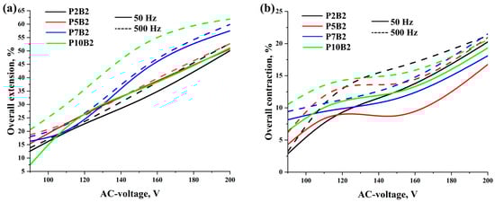 Overall extension/contraction of PVA hydrogels reinforced by (a) spiral weave and (b) fabric woven braided mesh under different values of AC voltage, frequency, and a load of 20 kPa. Standard deviations are presented in Tables S1–S8.