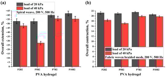 Overall extension/contraction of PVA hydrogels reinforced by (a) spiral weave and (b) fabric woven braided mesh under different load values, an AC voltage of 200 V, and a frequency of 500 Hz.