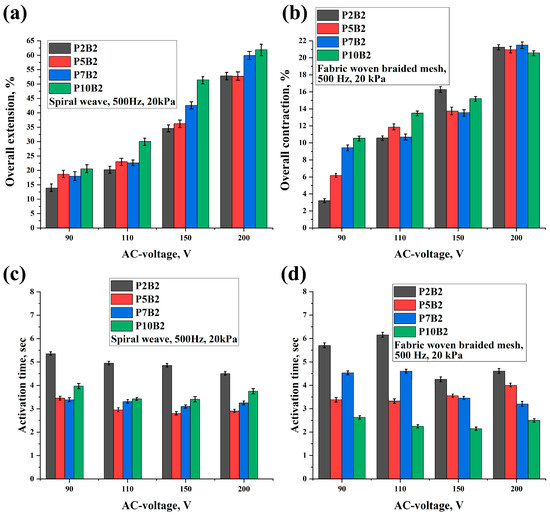 Overall extension (a) and contraction (b) of PVA hydrogels and their activation times (c,d) under a frequency of 500 Hz and load of 20 kPa at different values of AC voltage.