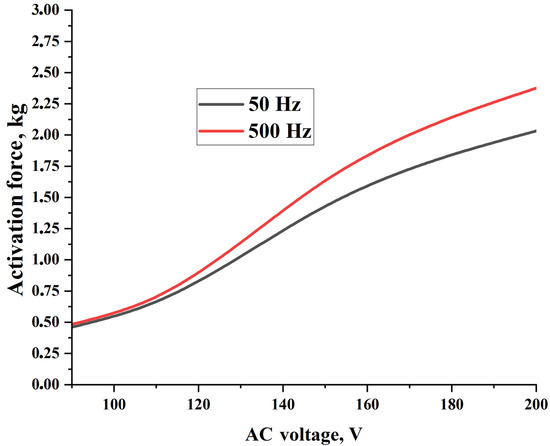 Table 7 and Figure 9 show the obtained force of the PVA hydrogel (P7B2) depending on the measurement procedure, which is described in Section 2.4.4. As can be seen, by increasing the values of AC voltage and frequency, the activation force was increased by up to 2.375 kg (297 kPa). Additionally, the required time for obtaining the maximum activation force was decreased from 4.18 s to 1.5 s under an AC voltage of 200 V and a frequency of 500 Hz. The temperature changes during the activation process for the PVA hydrogel were found to be within the range of 90–110 °C (see Video S6). Moreover, by increasing the values of AC voltage and frequency, the amount of water vapor formed was increased, while the formation time was decreased.