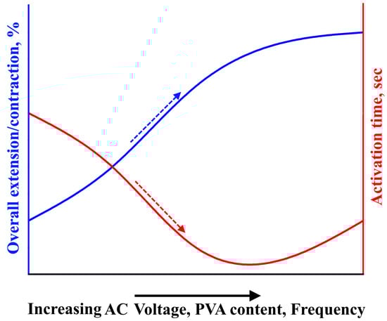 Figure 6, Figure 7 and Figure 8, Tables S1–S8, and Figures S1–S4 show the results of the overall extension, contraction, and activation time of PVA hydrogels under varying AC voltage, frequencies, and loads.