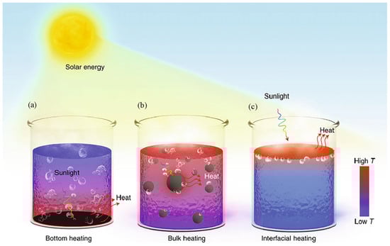 Depending on the location of the photothermal material, the solar steam systems can be divided into three different heating methods: bottom heating, bulk heating, and interfacial heating, as shown in Figure 1. Bottom heating is a photothermal conversion process that fixes active materials at the bottom of a water body. This method requires heating most of the water body (Figure 1a) [34]. Due to the long distance from the bottom to the surface of the water body, there is a heat transfer loss in addition to the light loss caused by water reflection. The generation of these losses reduces the energy use efficiency of the evaporator. Figure 1b represents the bulk heating with plasma nanoparticles as the photothermal material uniformly dispersed throughout the water body [35]. Since nanoparticles have excellent light absorption properties, when exposed to sunlight, the temperature rises rapidly, causing the nanoparticles to become encapsulated in water vapor [36]. Under continuous light exposure, the vapor layer propels the nanoparticles to float on the surface of the water. However, bulk heating can only improve energy efficiency to a certain extent [37]. Preventing the aggregation of nanoparticles to make them uniformly dispersed under long-term sunlight exposure becomes a challenge. Obviously, both of the above methods require heating of the entire water body, which has the problem of low photothermal conversion efficiency, leading to limited practical applications. To effectively reduce heat transfer loss, the interfacial heating method has been proposed in recent years (Figure 1c) [38,39]. Interfacial heating means a photothermal material is placed between the air and water interface so that the light is wholly focused on a thin layer of water on the evaporating surface. The heat obtained from the local heating is employed to heat the water surface to produce steam. This type of heating reduces the heat transfer to the water body and minimizes heat loss [40,41]. Therefore, applying solar-driven interfacial steam technology can improve the thermal localization of the phase change interface and achieve efficient water evaporation.