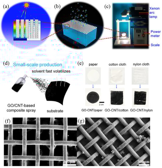 CNTs are one of the typical photothermal materials, which structurally feature large specific surface areas that help to enhance the local temperature of the surface, giving it good light absorption properties. Yin et al. [60] designed vertically aligned CNTs as the photothermal layer to achieve local heating by capturing an array of sunlight, which effectively improved the light absorption rate during device operation (as shown in Figure 2a–c). Hence, the evaporation efficiency of this structure is ten times higher than that of ordinary pure water evaporation and its solar thermal conversion efficiency is 90%. Compared with conventional carbon-based materials, reduced graphene oxide (rGO) has high light absorption properties. Meanwhile, it exhibits excellent high-temperature tolerance under long-term solar irradiation, which is one of the ideal properties for photothermal materials. Liao et al. [61] prepared a thin-film spectrally selective absorber by adjusting the thickness and reduction degree of internal two-dimensional (2D) graphene. The device consists of an aluminum substrate and an rGO film. This transmitter relies on high-temperature resistance and an excellent heat transfer ability to achieve a net water content of 0.94 mg cm−2·s−1 under six simulated sunlight conditions. More importantly, the device exhibits a high-temperature tolerance of 96 h at 800 °C and a theoretical long-term stability of 25 years at 177 °C. In addition, carbon-based composites have shown excellent performance in the field of solar interface evaporation. Zhang et al. [40] prepared GO/CNT as a photothermal material for thin-film evaporators. As shown in Figure 2d,e, they combined the industrial production technique with the spray method to evenly coat the carbon material on the substrate, thereby obtaining the thin-film evaporator. The evaporation rate of the thin-film evaporator prepared under optimal conditions was 2.1 kg·m−2·h−1 and the evaporation efficiency was 90.1% under a single solar irradiation.