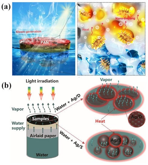 Photothermal material with plasma as a solar evaporator. (a) Schematic diagram of the device vapor generation with a novel sea cucumber-like nanostructure as the photothermal layer; reprinted with permission from [75], 2020, Royal Society of Chemistry. (b) Schematic diagram of the solar steam generating device composed of Ag and diatomite earth; reprinted with permission from [79], 2017, Royal Society of Chemistry.