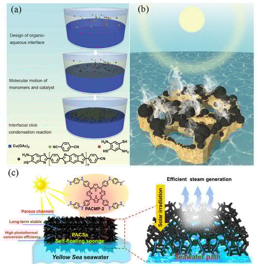 Solar vapor generation device with conjugated polymers as photothermal materials. (a) Schematic diagram of the polymerization process of conjugated polyphenylene diazole microspheres. (b) Structure of the evaporation device with microspheres combined with polyvinyl alcohol hydrogel; reprinted with permission from [81], 2022, Springer Nature. (c) Solar energy evaporator composed of conjugated microporous polymer; reprinted with permission from [87], 2022, American Chemical Society.