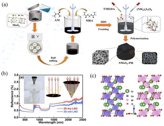 Water evaporation device using semiconductor material as a photothermal layer. (a) Preparation of porous hydrogel based on MoS2; reprinted with permission from [92], 2022, John Wiley and Sons. (b) Conical 3D structure when using metal oxides as a light-absorbing layer. (c) Schematic diagram of the crystal structures of LCO and LNO; reprinted with permission from [94], 2022, Elsevier.
