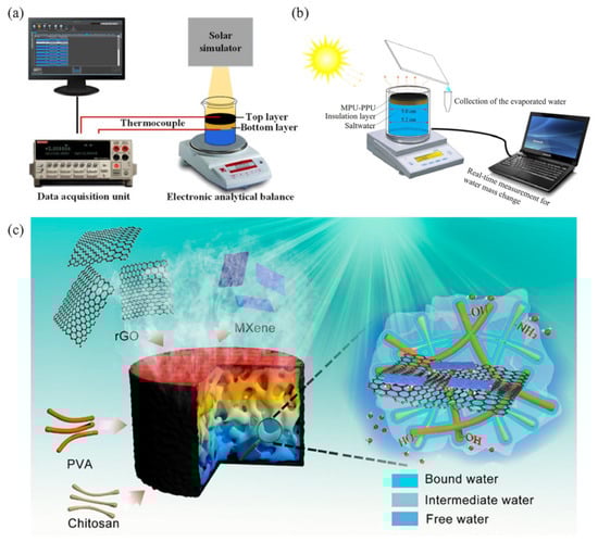 A schematic diagram of the structure of a two-layer solar vaporization power generator. (a) Device with carbon material as the absorber layer and wood as the insulating layer; reprinted with permission from [100], 2018, John Wiley and Sons. (b) Device where the insulating and absorbing layers are made of PU materials loaded with different active substances; reprinted with permission from [101], 2020, Elsevier. (c) Schematic diagram of a hybrid hydrogel with transition metal carbides embedded in a 2D nanostructure; reprinted with permission from [102], 2021, American Chemical Society.